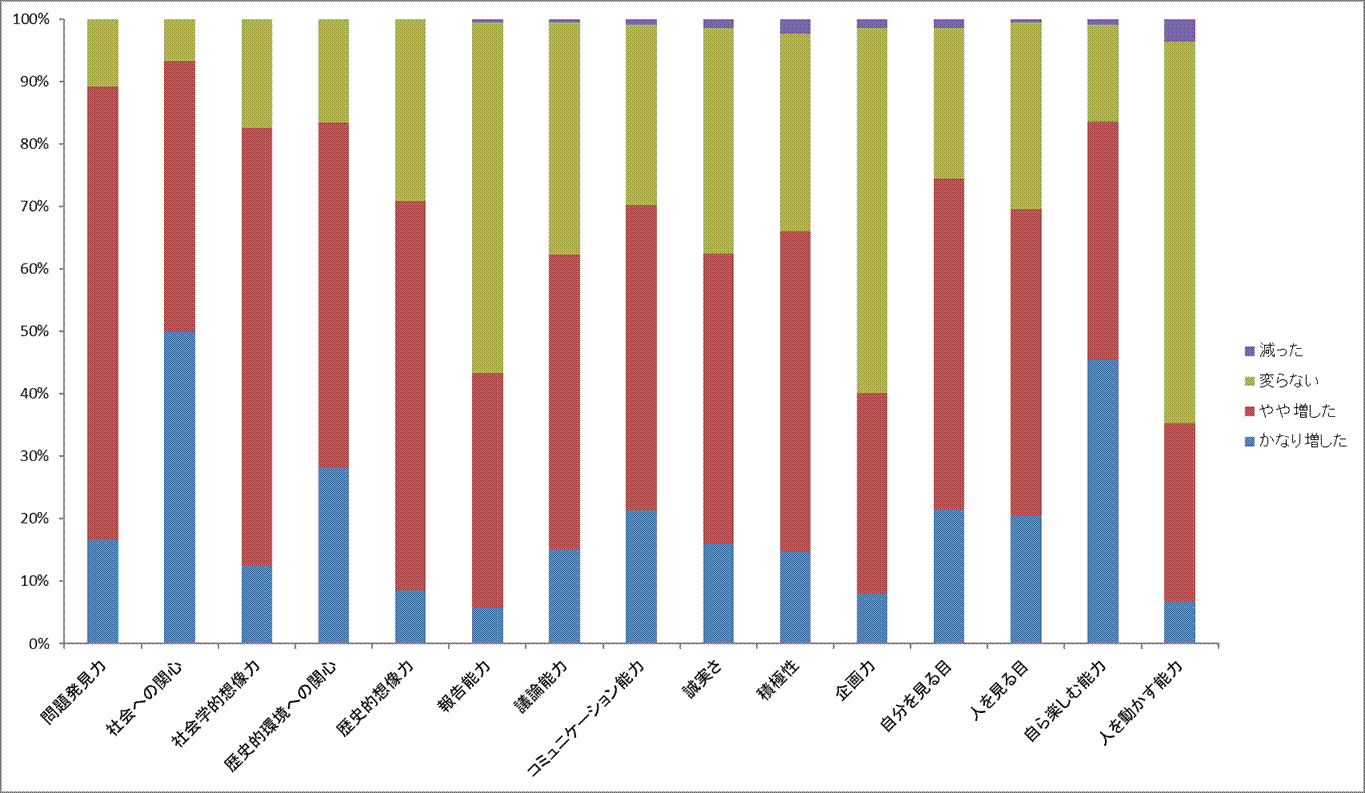 11期生から毎年3回生の最終ゼミで、この1年間で自分のどういう能力が伸びたかを自己評価してもらっています。下記のグラフは、2014年度の3回生である21期生まで224人分のデータです。かなり多くの人が自らの様々な能力が伸びたと自己評価してくれています。特に「かなり増した」という人が多いのは、「社会への関心」「自ら楽しむ能力」です。他にも8割以上の人が「かなり増した」あるいは「やや増した」と自己評価しているのは、「問題発見力」「社会学的想像力」「歴史的環境への関心」です。「増した」という人が半数に届かなかったのは、「報告能力」「企画力」「人を動かす力」の3つです。この3つも大切な能力ですが、能力が増したと実感できるには、少し時間がかかるようです。(2015.1.23記)