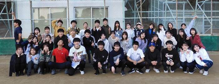 22.10.25)好天のもと、片桐杯ソフトボール大会を実施。両チームとも女性陣も含めて全員参加を原則として楽しく試合を行う。本来の実力は野球経験者が多い28期生が圧倒的に上のはずだったが、27期生3名に29期生チームに加わってもらい、かつ強打者の打席では、内野を減らして経験者が外野を守るという29期生キャプテンの奇策によって、思いがけず接戦に持ち込み、なんと延長戦へ。延長8回に1点を取った29期生が逃げ切るかと思われたが、さすがに28期生。昨年の轍は踏まず、逆転サヨナラ勝ちをおさめる。MVPは打ちやすい球を投げ続けて完投し、かつ最後のサヨナラヒットを打った28期生SA君に与える。(右写真:片桐杯参加者全員の集合写真)