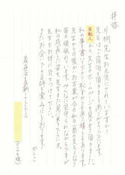上でエピソードを紹介したSホテルの彼女から手紙をいただきましたので、許可を得て、掲載させてもらうことにしました。嬉しいですよね、こういうつながりができることは。手紙なんてほとんど書かない世代でしょうから、さぞや苦労したことでしょう(裏話は、「ゼミ生以外の方々からの声」102に掲載した支配人OT君からのメールをご覧下さい)。でも、この1枚の手紙が届けてくれた思いは、とても大きなものです。鞆に行く楽しみがまたひとつ増えました。