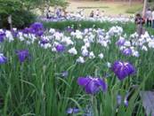 見頃の菖蒲田も堪能することができました。菖蒲って好きな花なんですよね。あの折り紙のような花弁と繊細な色合い、そして和風な花の名に日本的な美を感じるのは私だけではないでしょう。日本庭園の入口前にはバラ園もあり、結構咲いていましたが、バラは名前と言い形といい非常に西欧的で菖蒲とは好対照です。さて、暗くなってきたので、いよいよホタルを見に歩き始めました。最初のうちは小さなホタル(平家ホタル)をたまに見つけられるぐらいで、「まあ、やっぱりこんなものかなあ」と「小満足」程度で歩いていたのですが、源氏ホタルがたくさんいるゾー