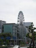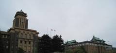 2kmの南北の通りをそのまま公園にしています。ベンチに座っている不思議な母子の彫像やビルにへばりつく観覧車(右上写真)などを見ながら、テレビ塔までたどりつきます。名古屋テレビ塔(左写真)は昭和29年に建てられた日本最初の電波鉄塔です。テレビの放送開始が昭和28年で、まだまだテレビの将来性が見えなかった頃に建設したのですから、名古屋人は先見の明があると言ってもよいでしょう。形から言っても、東京タワーのモデルになったのだろうと推測できます。テレビ塔を越え、さらに北に向かい、けやき並木を抜けると愛知県庁が見えてきます。隣には名古屋市役所があります。この2つの建物(右写真)は戦前に建てられた近代建築ですが、上に城郭風の屋根装飾を持つというおもしろいデザインの建物です。名古屋城が近いので、それに合わせたのでしょうが、ユニークなセンスです。