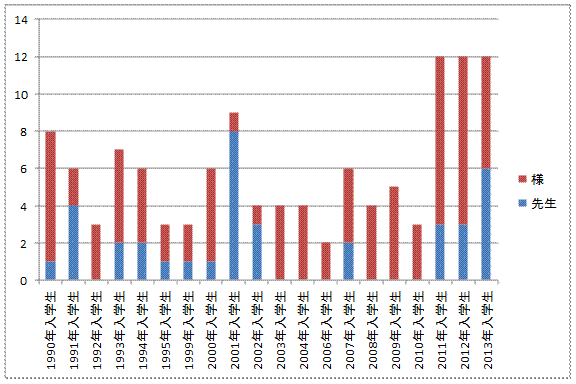左記のグラフは、関大片桐ゼミで今年年賀状をくれた人たちを入学年別に分けて、宛名を「先生」にしてあったか「様」にしてあったかで色分けしたものです。まず、「先生」か「様」かの分析に入る前に絶対数が気になるかと思います。現役の4回生、3回生、2回生は、各学年ともに12人が年賀状を送ってくれていて、これが最高数です。卒業1年目の2010年入学生も昨年は2日までに同じく12本、卒業後2年目の2009年入学生も一昨年には11本送ってくれていましたので、現役の時は正月明けに私と顔を合わせざるをえないからでしょうが、「義務」として送るけれど、卒業後は一気に減るという、「悲しい」事実が確認されます。また、年賀状文化は、携帯が普及してから急速に衰退してきましたので、高校入学とともにi-modeに出会い、携帯が高校生の時から不可欠になった2002年入学生から一気に減っているのは納得のいくところです。卒業してかなり時間が経った2001年入学以前の卒業生の方が、最近の卒業生より年賀状が多いのは、年賀状文化がまだ大学時代にかなり生きていたからだと思います(ちなみに、1996年と1997年入学生の時はゼミ募集をしていません)。