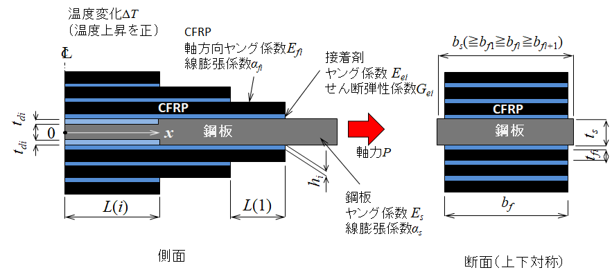 | CFRP / 接着剤(層)(Ef(i), tf(i), bf(i), Ge(i), h(i), CFRPの線膨張係数αf(i)) | ||||||